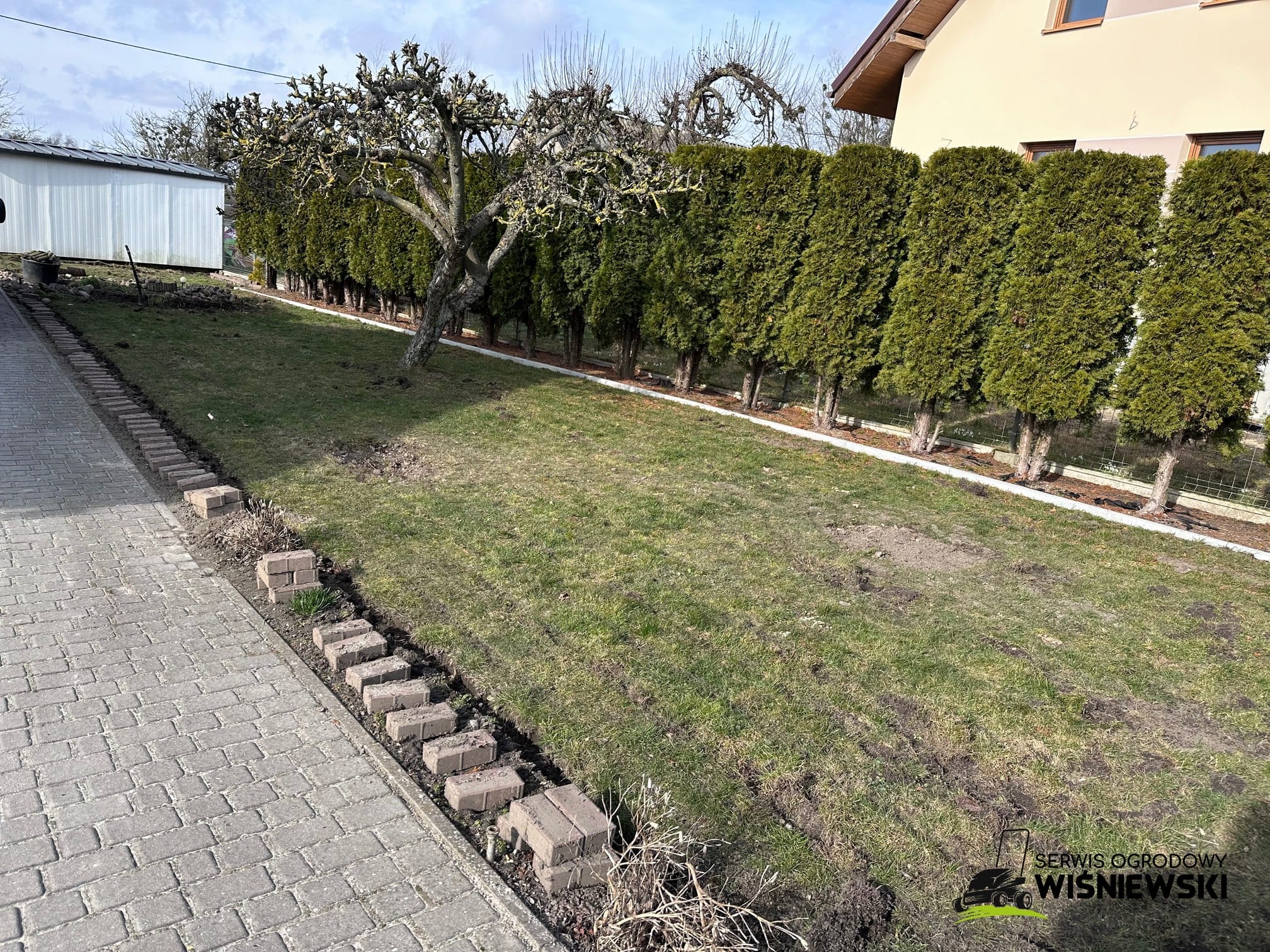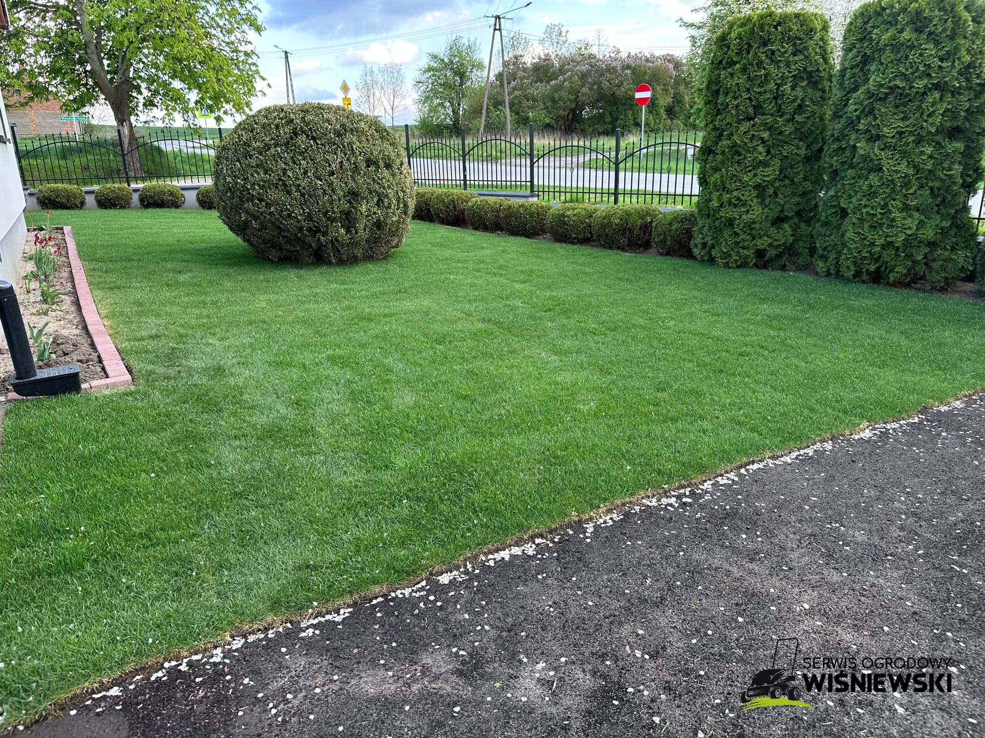 W części ogrodu położony został trawnik z rolki, natomiast pozostała część została obsiana wysokiej jakości mieszanką traw. Takie rozwiązanie pozwoliło uzyskać równomierny i naturalny efekt przy jednoczesnej optymalizacji kosztów. Całość została odpowiednio nawieziona, by przyspieszyć ukorzenianie się trawy i wzmocnić roślinność od samego początku.