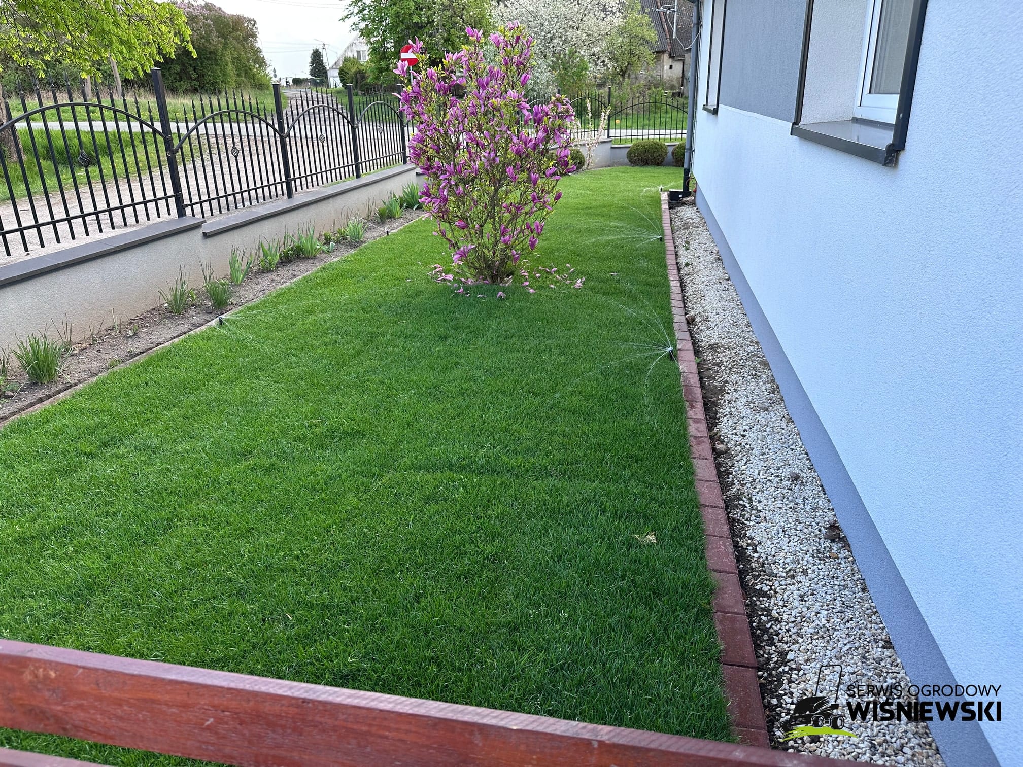 Prace rozpoczęliśmy od zerwania starej darni i wyrównania terenu. W celu zabezpieczenia trawnika przed działalnością kretów cała powierzchnia została zabezpieczona specjalną siatką ochronną. Zadbaliśmy również o komfort użytkowników i optymalne warunki wzrostu roślin – wykonując automatyczny system nawadniania, który równomiernie i efektywnie podlewa całą działkę.